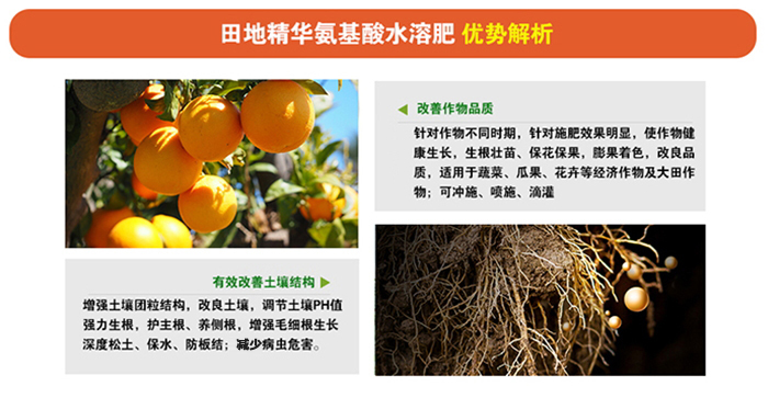 田地精华含氨基酸水溶肥,是氨基酸与铁、锌、硼等螯合微量元素融合在一起研磨而成的叶面肥。根据作物生长阶段所需营养设计配方,用于叶面喷施,省时省力。
